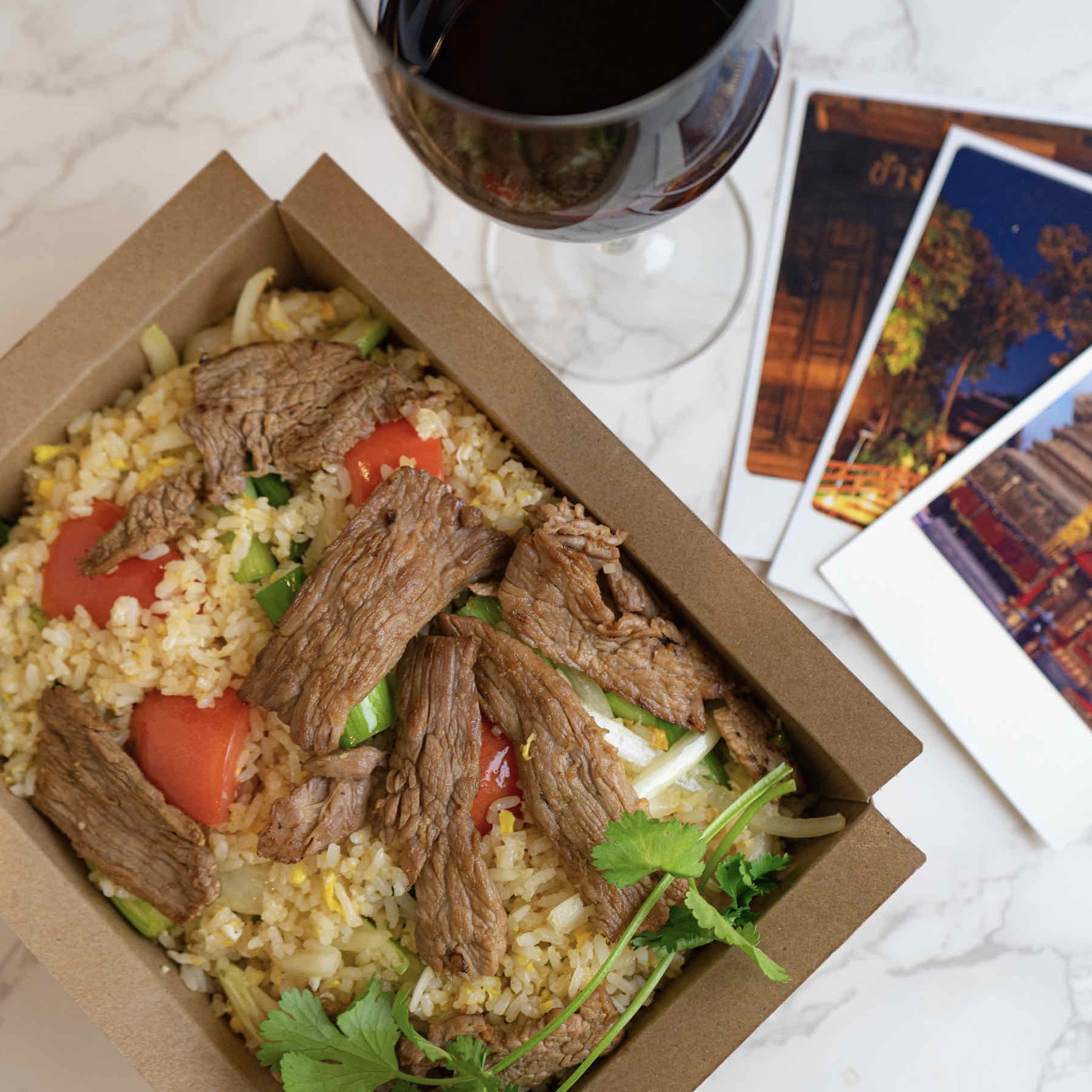 Jasmine rice stir-fried with Thai basil, garlic, egg, white onions, and red & green peppers. Customize your spice level and protein.