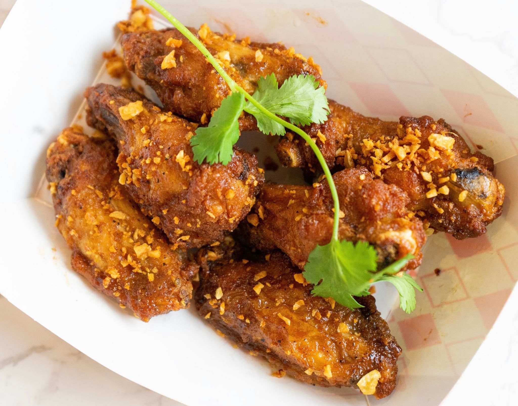 (6) Crispy fried wings, glazed in Thai sweet chili and Sriracha sauce.
